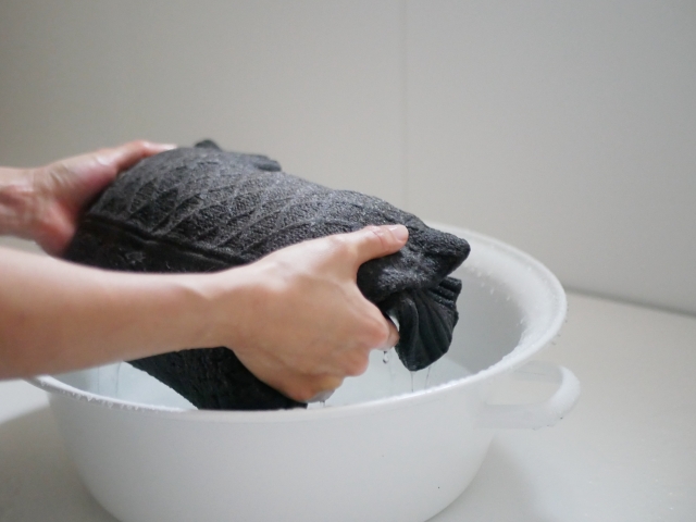 たらいに30℃~35℃のぬるま湯を用意し、中性洗剤を混ぜます。汚れた部分が外側になるように畳んだニットを、ゆっくりとぬるま湯に浸します。